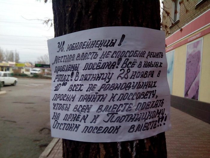 28 листопада 2014 р., у смт Ювілейний призначено зустріч усіх охочих мешканців селища, які вирушать на колективну зустріч із так званим главою так званої республіки. Ювілейненці вважають місцеву владу “імпотентами” і хочуть перевірити, чи “імпотент” Плотницький. У населеному пункті понад 5 місяців немає електрики та води, а з настанням холодів, відповідно немає опалення. Температура у квартирах 2-4 градуси тепла. Подробиці на фото:
